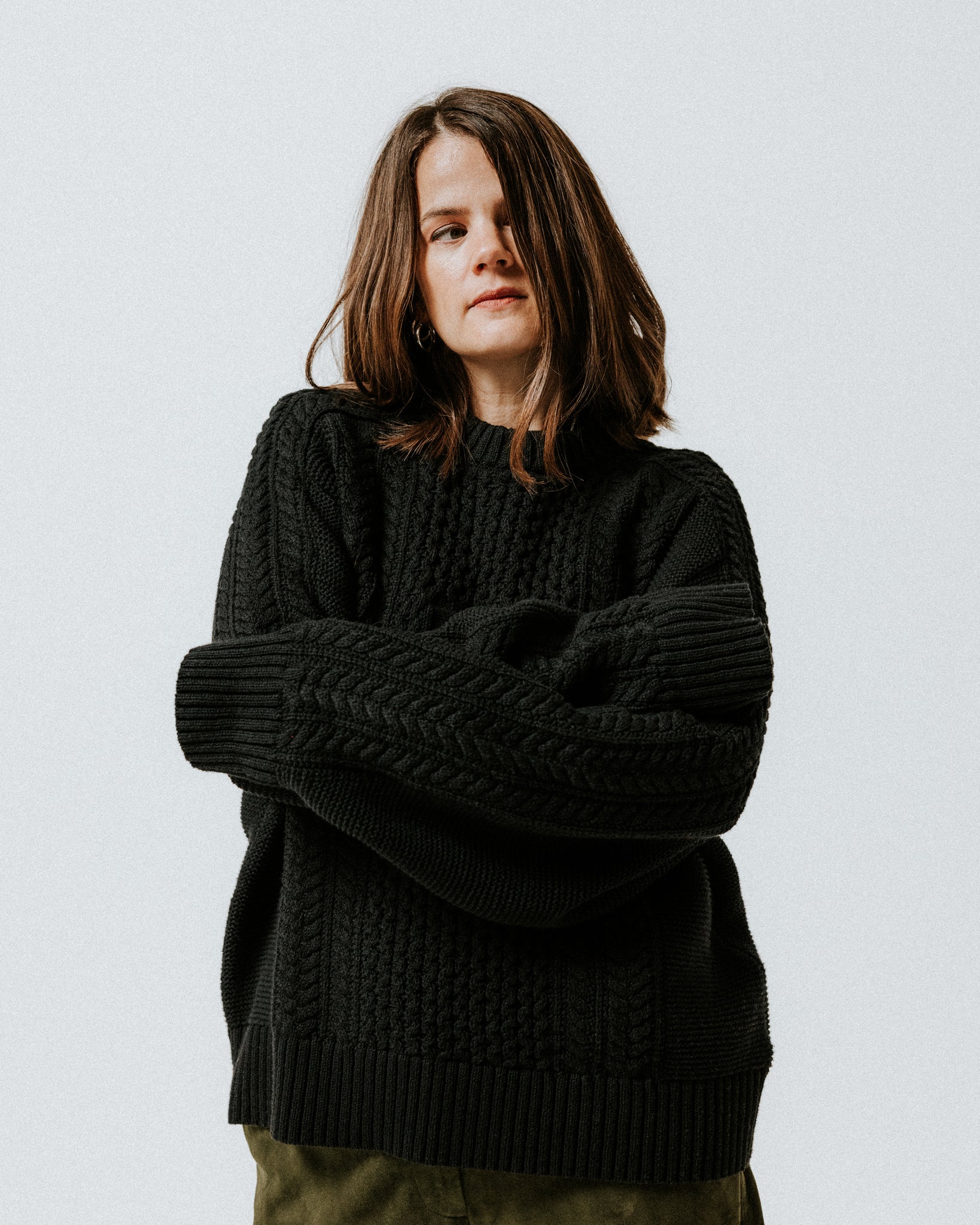 Slow Love's take on the traditional aran jumper. The block is boxy with a slight ballooned sleeve. Made from 100% cotton, this aran features a mix of traditional cables with the SL initials integrally sitting amongst them.